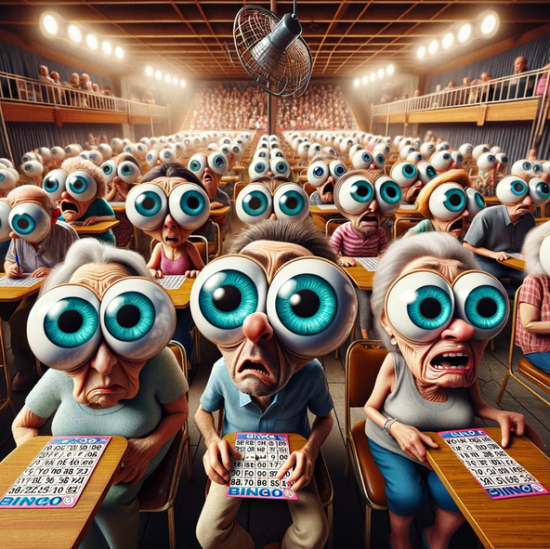 Bingo is odd today. Balls are not moving. Cards are blank. People are confused. Balls won’t play. People are tired. No one is talking. No fun. Faces are funny. Eyes are open big. Balls are hiding. The day is strange. All is waiting. Bingo is fun now.