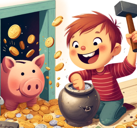 Tim finds an old piggy bank. He shakes it. Coins jingle inside. Tim feels curious. He wants to see his treasure. Tim grabs a hammer. He aims and swings. The piggy bank breaks open. Coins spill everywhere. Tim laughs. He counts the money. It feels like a fortune. Tim plans to buy a big toy. His piggy bank adventure makes him happy. Tim loves his shiny coins.