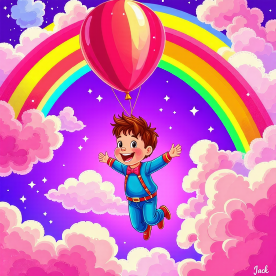 Jack finds a balloon. He holds it. The balloon floats up. Jack flies with it. He sees clouds. The clouds are pink. Jack feels joy. Birds wave at him. The sky is purple. Jack laughs loud. A rainbow appears. Jack touches it. Colors splash everywhere. Jack smiles big. He lands safely. The balloon pops. Jack walks home. He feels happy. Jack forgets the adventure. Ignorance is bliss.