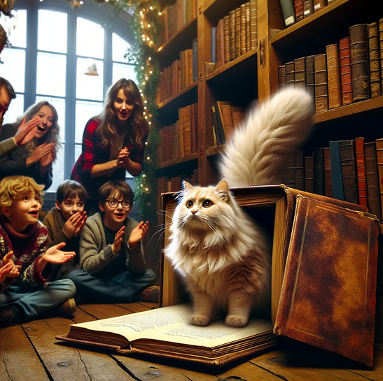 A cat jumps very high. It flies up. The cat reaches the moon. People watch in awe. The cat sets a record. No cat jumps this high. The cat lands safely. People cheer and clap. The cat smiles. It feels proud. The cat walks away. Everyone remembers the cat. The cat’s jump stays famous. It is a legend.