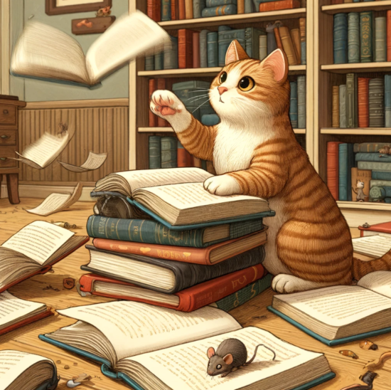 A cat sits on a pile of books. It feels curious. It swats a book with its paw. The book flips open. The cat swats another book. Pages fly around. The cat jumps. it pounces. It looks like it studies hard. A mouse peeks out. The cat spots the mouse. It forgets the books. The cat chases the mouse. The books rest. The cat’s study time ends.