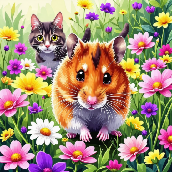 A hamster runs away.It finds a garden.The garden is big.The hamster sees flowers.It smells the flowers.A cat appears suddenly.The hamster hides quickly.The cat searches.The hamster stays quiet.The cat leaves.The hamster feels safe.It runs back home.Home is cozy.Adventure ends happily.