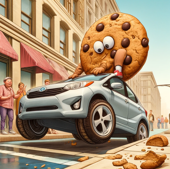 A cookie is alive. It is sweet. A car is shiny. It is new. The cookie is adventurous. It is climbing the car. Tires are tall. The roof is slippery. Passersby are puzzled. They are watching. The cookie is bold. Crumbs are everywhere. Laughter is loud. The street is merry.