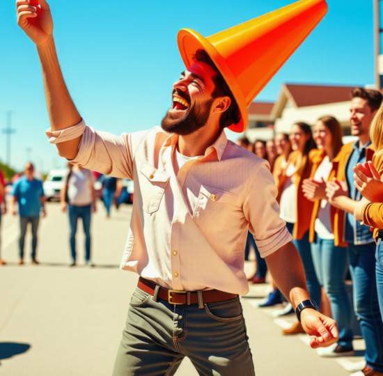 A man finds a traffic cone. The cone sits on the street. It looks orange and pointy. The man stops his car. He exits. He grabs the cone. He places it on his head like a hat. He starts to dance. The dance looks silly. Cars honk. People laugh. The cone wobbles. The man smiles. It makes a happy day.