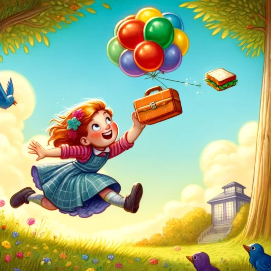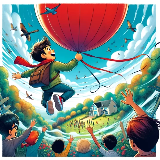 Tim holds a big red balloon. It pulls him up fast. Tim floats above trees. Birds fly near him. Tim waves. The balloon rises higher. Tim sees his house small. He laughs. The wind blows strong. Tim drifts over the park. Kids point up. Tim feels like a hero. He lands soft. Everyone cheers. Tim’s adventure feels amazing. What a way to go!
