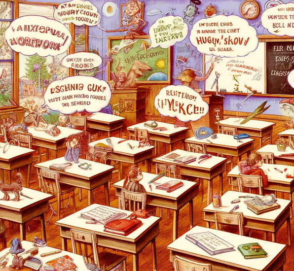Homework is due. Desks are empty. Books are closed. Kids are sneaky. They are quiet. Teachers are puzzled. They are asking. Excuses are wild. Dogs are hungry. Aliens are thieves. Laughter is loud. School is funny. Lessons are learned. Pens are still. The classroom is merry.