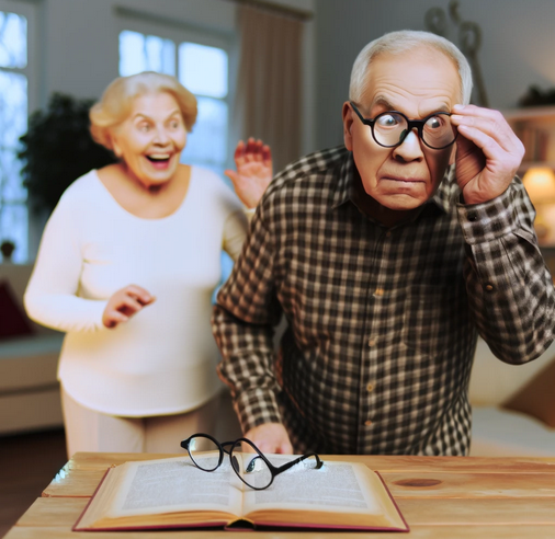 He is old. His glasses are on a book. His wife is clever. She is hiding them. He is looking. They are gone! His eyes are wide. The wife are laughing. The glasses are sneaky. They are found. Goodbye is just a joke. The house is merry.