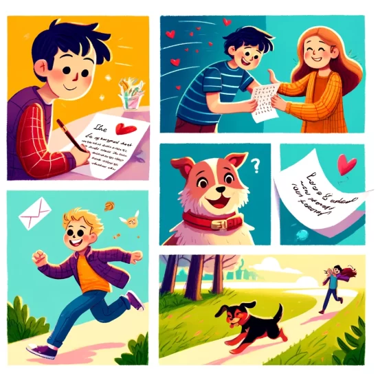 Tim likes Lily. He feels nervous. He writes her a note. His dog grabs it. The dog runs outside. Tim chases the dog. The note flies away. Lily finds the note. She reads it. Lily smiles. She runs to Tim. They laugh together. Tim feels happy. They walk to the park. The day feels perfect. Tim’s plan works. Asking out can be fun!