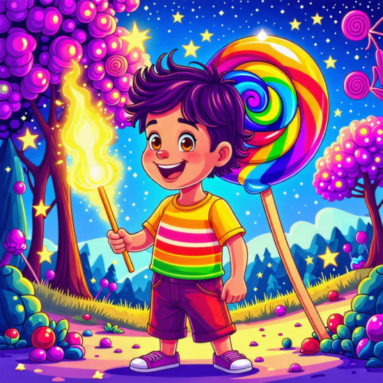 A boy finds a magic stick. He waves the stick. A giant, rainbow-colored lollipop appears. The boy licks the lollipop. It tastes like every flavor imaginable! The lollipop does not shrink. The boy smiles. He loves it. He keeps it close. The boy never leaves. He stays forever. He enjoys the candy.