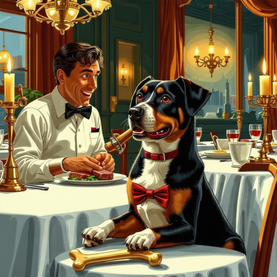 A dog loves his bone. He takes it everywhere. Today is special. He goes to a fancy restaurant. He has a reservation. It surprised the waiter. The dog is polite. He orders steak. He shares his bone. The waiter smiles.