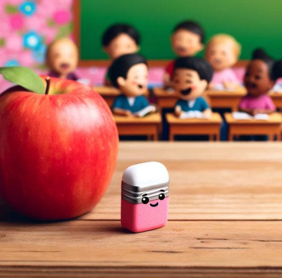 An eraser is small. It is pink. An apple is big. It is red. A desk is wooden. The eraser is afraid. The apple is close. It is smelling sweet. The eraser is thinking. It will be erased. Children are giggling. They know truth. An apple can’t erase. It is just tasty. School is joyful. The eraser is safe.